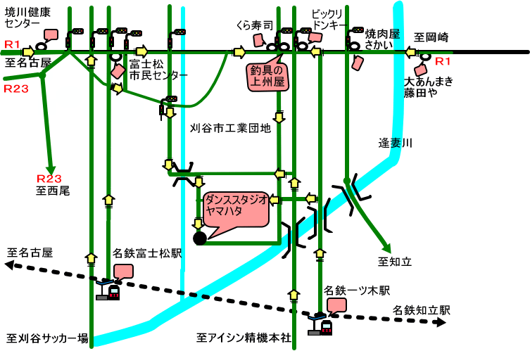 車1 :国道1号線名古屋、豊明方面から境川健康センターを左に見て6つ目の信号